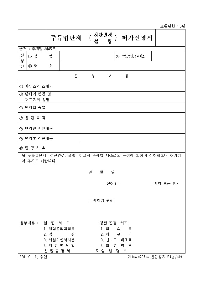 위 주류업단체 {정관변경, 설립} 하고자 주세법 제45조의 규정에 의하여 신청하오니 허가하여 주시기 바랍니다.
