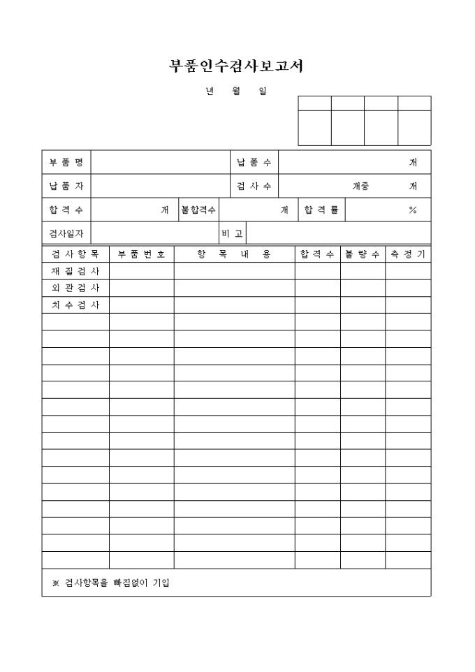 부품의 재질,외관,치수 등의 항목을 검사하여 그 결과를 기입하는 양식입니다.