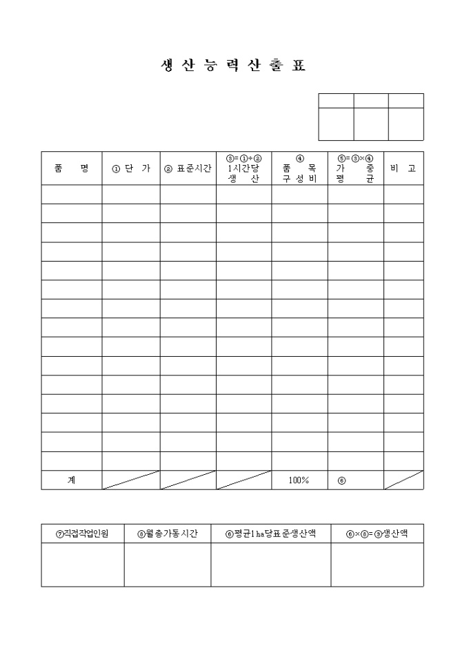 생산능력산출할 수 있는 단가, 표준시간, 1시간당 생산, 품목구성비, 가중평균을 기록하는 양식입니다.