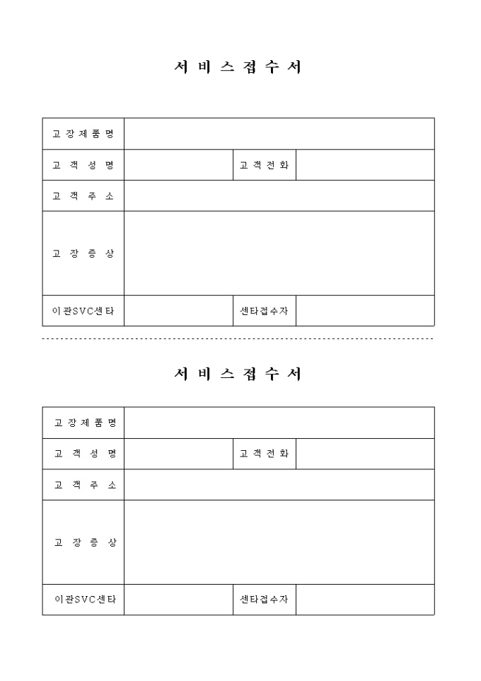 9,000원/월고장제품명, 고객성명, 고객주소, 고장증상 등을 기록하는 양식입니다.