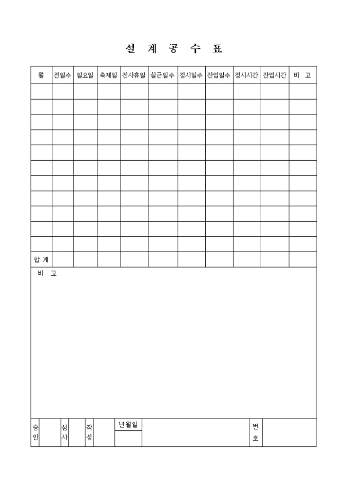 9,000원/월전일수, 일요일, 축제일, 전사휴일, 실근일수, 정시일수, 전업일수, 정시시간 등을 기록하는 양식입니다.