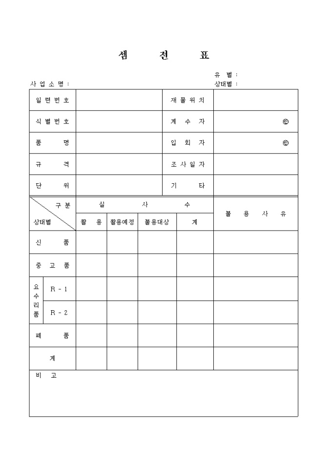 물품의 상태별로 실사수를 조사하고 불용대상의 사유를 기록하는 양식입니다.