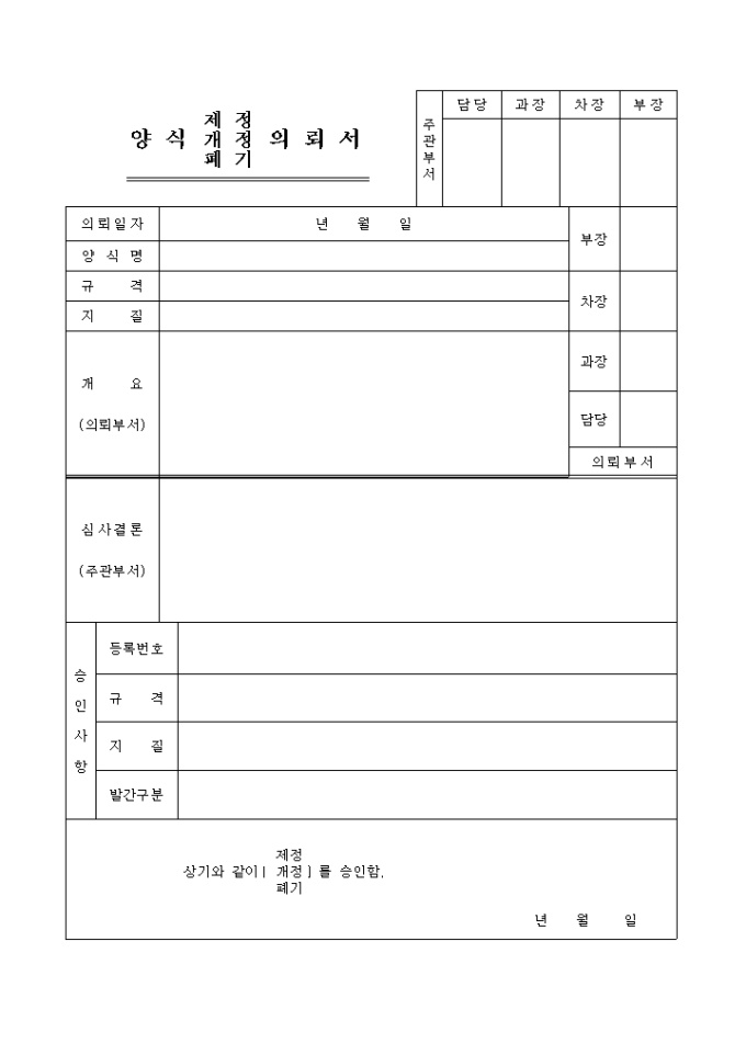 양식의 제정, 개정, 폐기를 의뢰하는 양식으로 의뢰부서의 개요와 주관부서의 심사결론을 기록합니다.