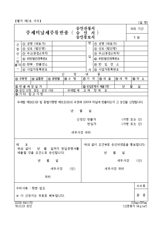 9,000원/월주세 미납세 주류반출(승인신청서,승인서,승인통보서) 양식 예제입니다.