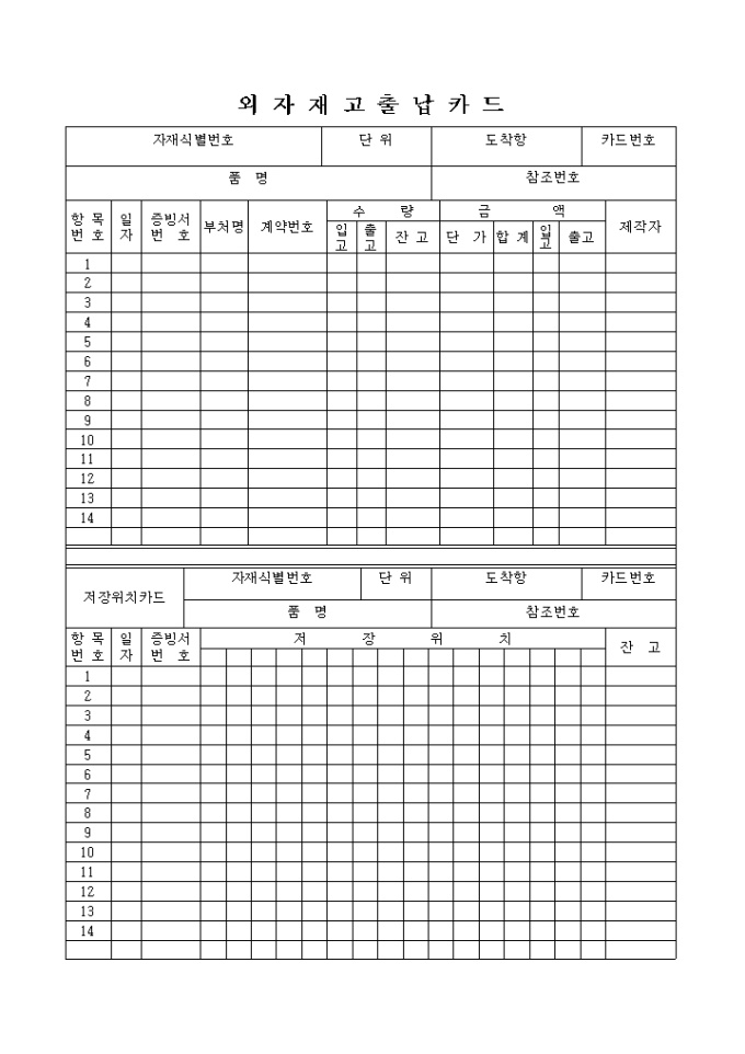 9,000원/월품명의 내역과 단가, 입고, 출고를 기록하는 양식입니다.