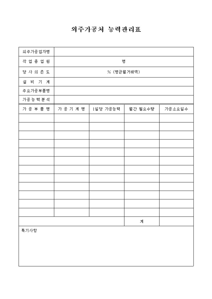 9,000원/월가공부품명,가공기계명,1일당 가공능력,월간 필요수령,가공소요일수를 기록하는 양식입니다.