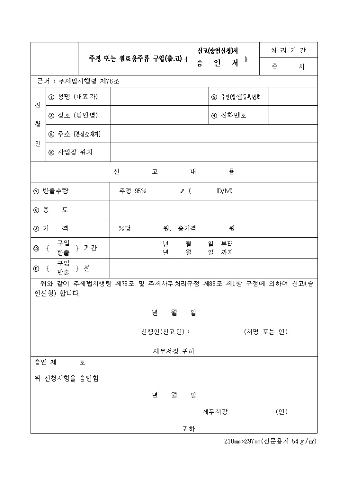 주정또는 원료용주류구입(출고)(신고(승인신청)서, 승인서)