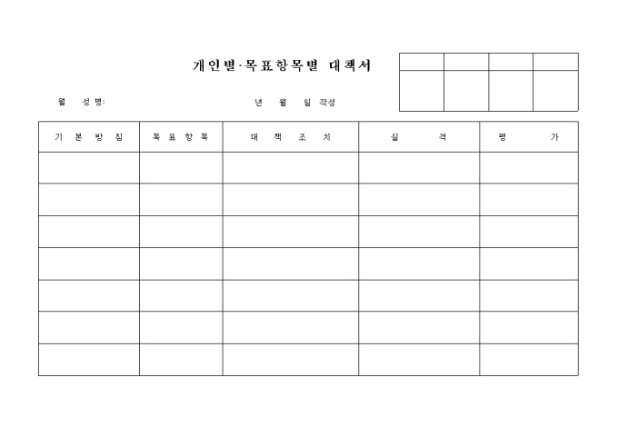 9,000원/월개인별 기본방침, 목표항목, 대책조치, 실적, 평가를 기록하는 양식입니다,