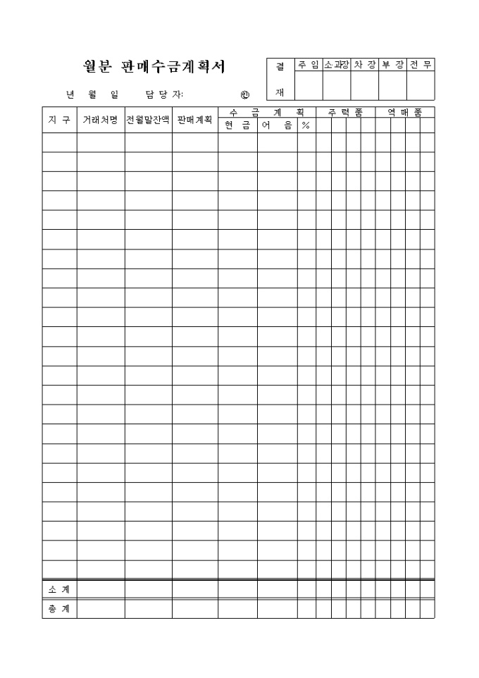 9,000원/월거래처별 전월말잔액,판매계획,수금계획,주력품,역매품을 기록하는 양식입니다,