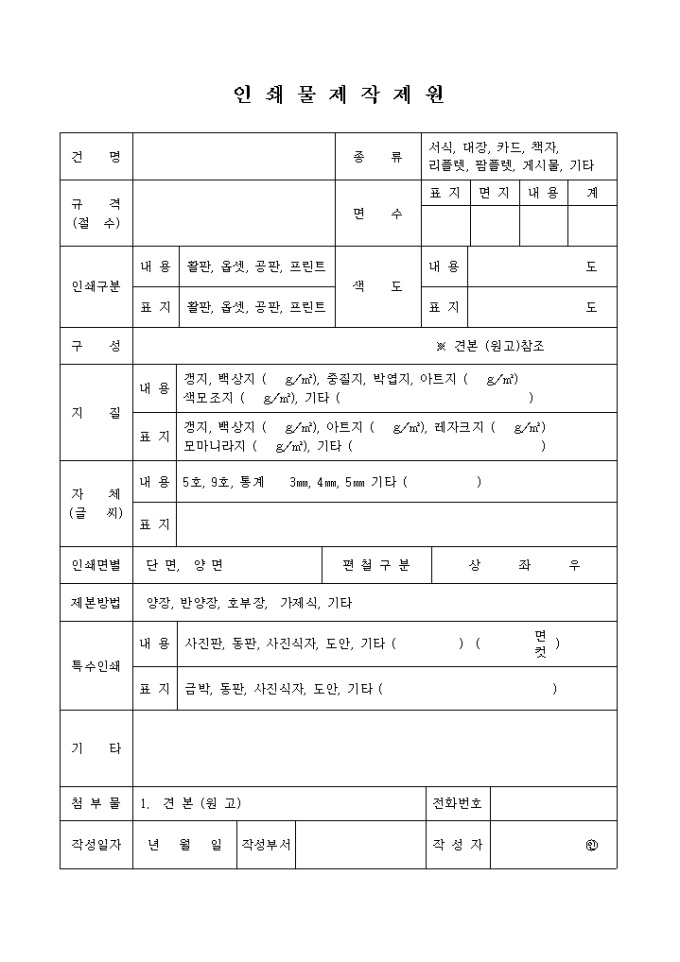 9,000원/월제작할 인쇄물의 지질, 자체, 인쇄면별, 제본방법, 특수인쇄 등을 기록하는 양식입니다.