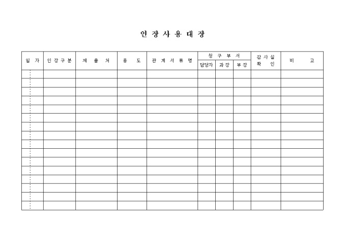 인장사용 부처와 용도 관계서류명을 기재하는 양식입니다.