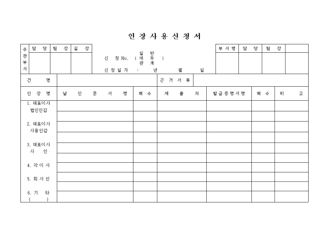 9,000원/월인장별 날인문서명, 매수, 제출처, 발급증명서명 등을 기록하는 양식입니다.
