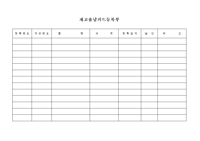 등록번호, 저장번호, 품명, 규격, 등록일자, 날인으로 구성된 재고출납카드등록부입니다.