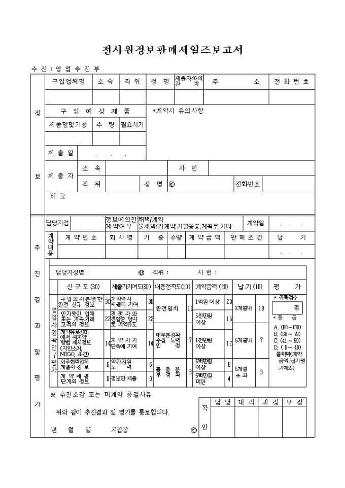 구입예상 제품의 정보와 판매 추진결과 및 평가의 내용을 기록하는 양식입니다.