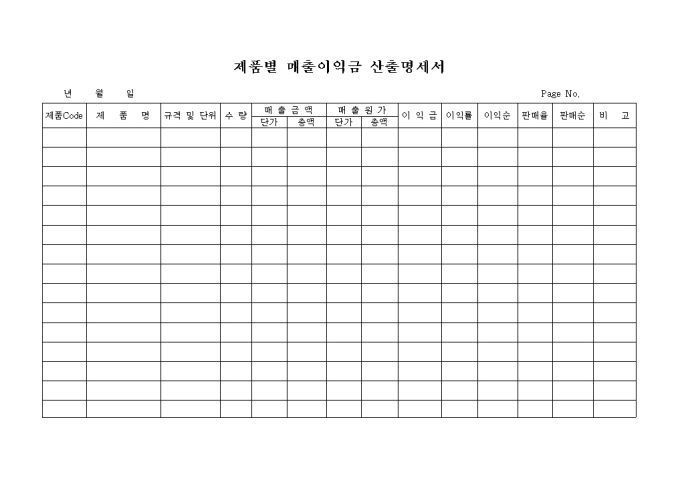 9,000원/월제품별 매출금액, 매출원가, 이익금, 이익률, 이익순, 판매율을 기록하는 양식입니다.