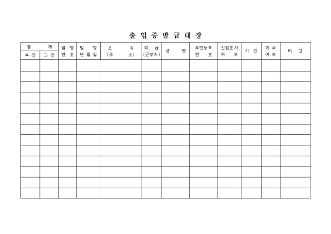 9,000원/월소속, 직급, 성명, 주민번호, 신원조사여부 등으로 구성된 출입증발급대장입니다.