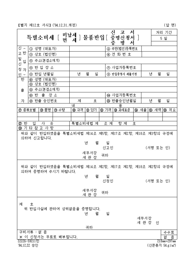특별소비세(미납세,면세) 물품반입(신고서,증명신청서,증명서) 양식 예제입니다.