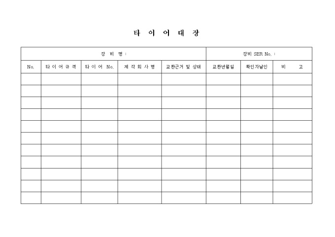 타이어 규격, 번호, 제작회사명, 교환근거 및 상태, 교환녀월일 등을 기록한 양식입니다.