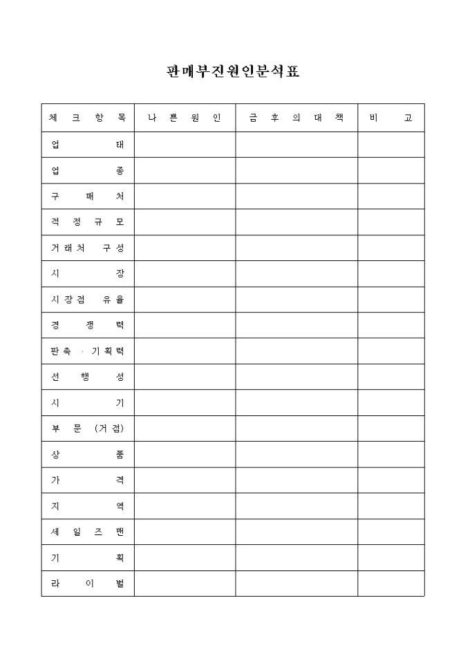 9,000원/월업태, 업종, 구매처, 적정규모, 거래처 구성, 시장, 시장점유율, 경쟁력, 판촉, 기획력, 선행성 등이 항목을 체크하여 대책을 기록하는 양식입니다.
