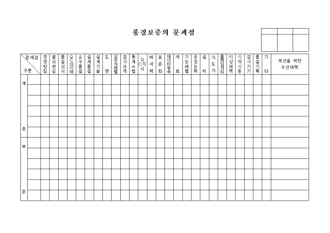 계층, 부문별 경영방침.열의관심, 품질의식, QC의 이애, 요구품질, 설계품질, 설계기술, 도면등의 상태를 기록하는 양식입니다.