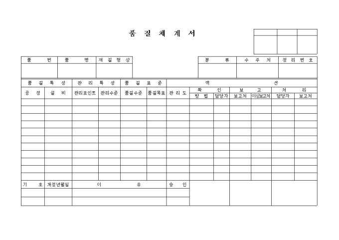 9,000원/월품질특성, 관리특성, 품질표준, 액션 등으로 구성된 품질체계서입니다.
