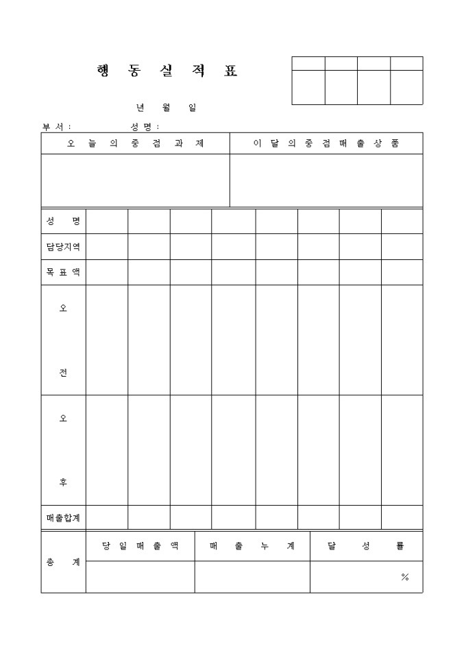 9,000원/월당일 중점과제와 당월 중점매출상품, 오전 오후별 목표액, 당일매출액, 매출누계, 달성률을 기록하는 행동실적표입니다.