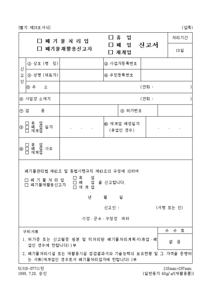 폐기물관리법 제42조 및 동법시행규칙 제43조의 규정에 의하여 (□ 폐 기 물 처 리 업/□ 폐기물재활용신고자)(□ 휴 업/□ 폐 업/□ 재 개 업)을 신고 하실때 사용하는 양식입니다.