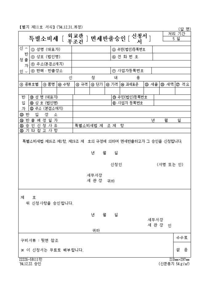 특별소비세법 제16조 제1항, 제19조 제 호의 규정에 의하여 면세반출하고자 그 승인을 신청합니다.