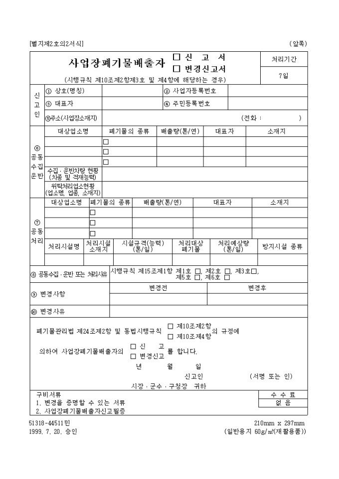 폐기물관리법02의2서식(99.08.09)-사업장폐기물배출자(변경)신고서 입니다.