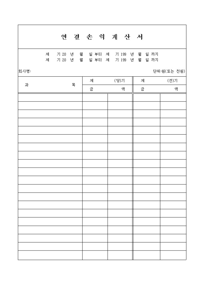 9,000원/월연결손익계산서(전) 양식입니다. 과목별 당기항목과 전기항목으로 구성되어 있는 양식입니다.