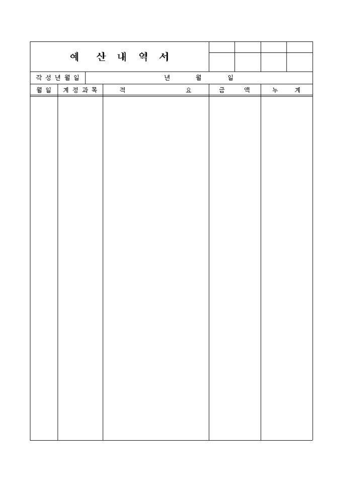 예산내역서 양식입니다. 월일별 계정과목과 적요, 금액, 누계의 항목으로 구성된 양식입니다.