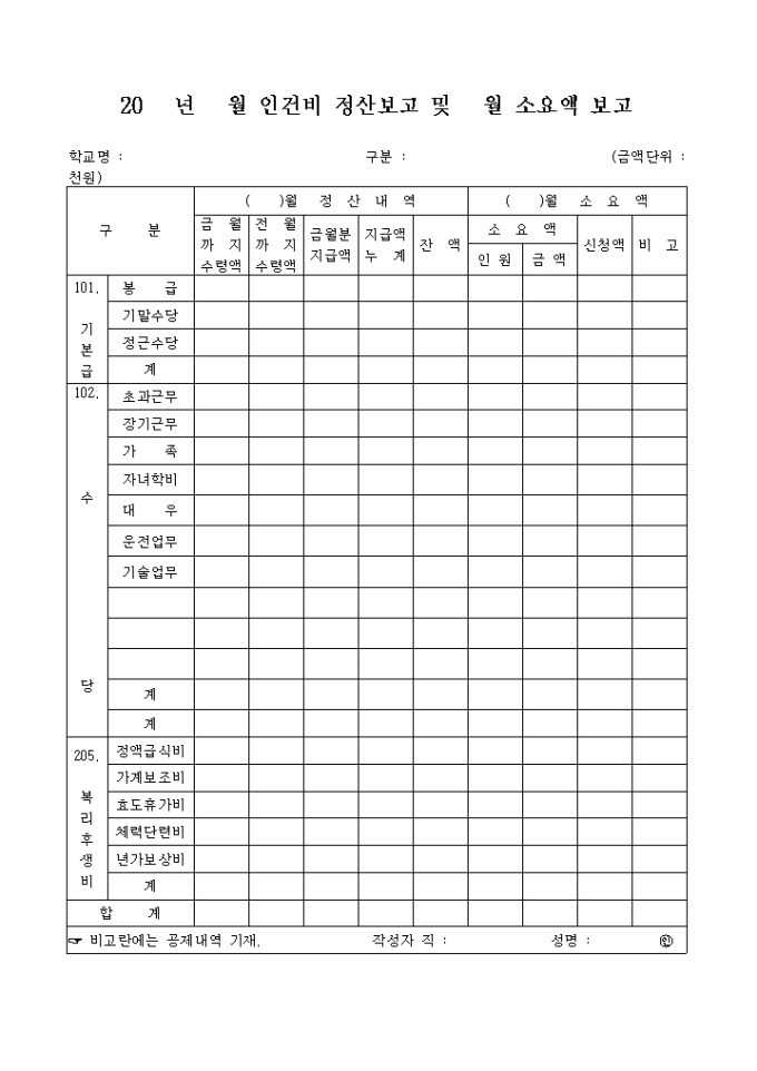 9,000원/월월인건비정선보고 및 월소요액 보고 양식입니다.