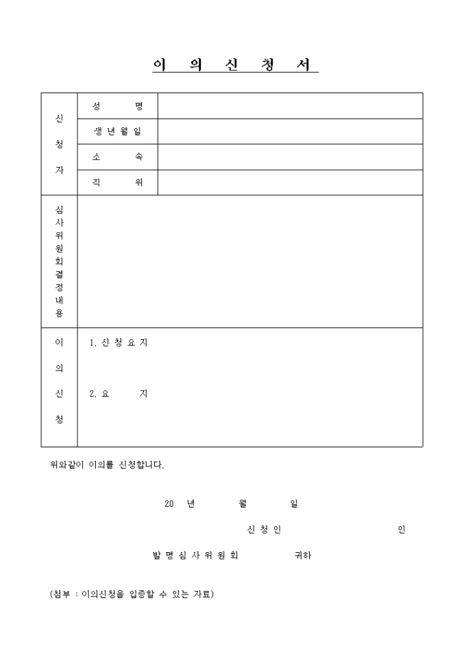 이익신청서 양식입니다. 신청자/심사위원회결정내용/이의신청내용으로 구성되어있는 양식입니다.