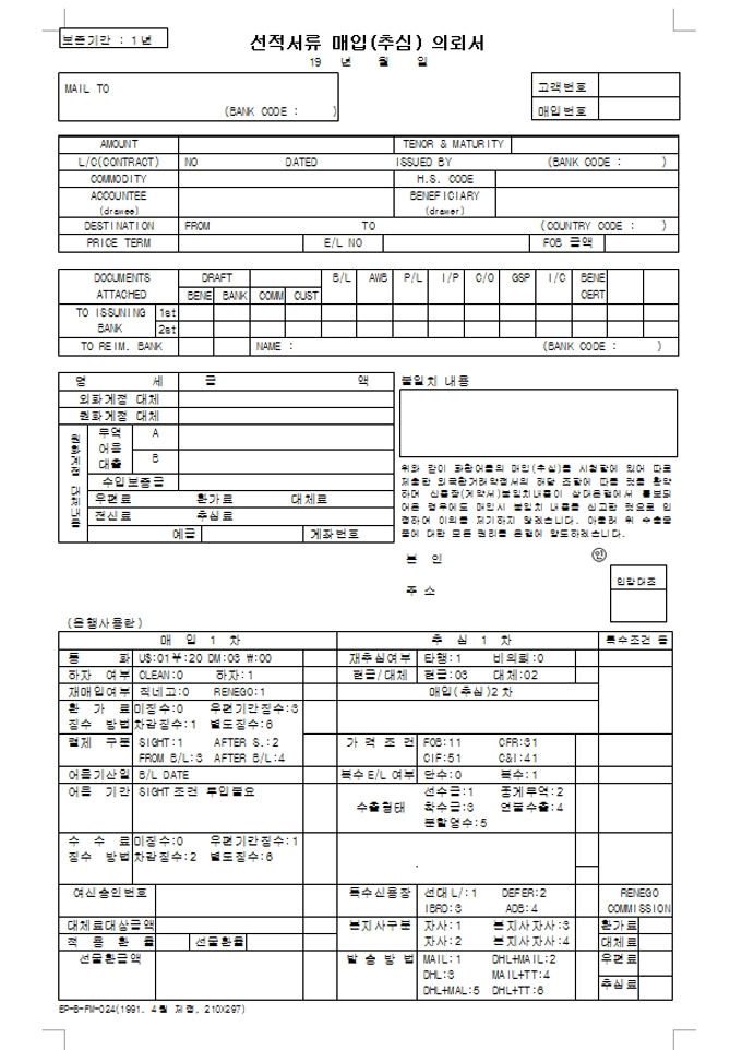 9,000원/월선적서류매입(추심)의뢰서 양식입니다. 위와 같이 화환어음의 매입(추심)을 시청함에 있어 따로 제출한 외국환거래약정서의 해당 조항에 따를 것을 확약하며 신용장(계약서)불일치내용이 상대은행에서 통보되어온 경우에도 매입시 불일치 내용을 신고한 것으로 인정하여 이의를 제기하지 않겠습니다. 아울러 위 수출물품에 대한 모든 권리를 은행에 양도하겠습니다. ...