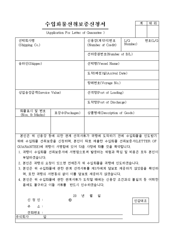 9,000원/월수출입화물 선취보증 신청서 양식입니다. 본인은 위 신용장 등에 의한 관계 선적서류가 귀행에 도착하기 전에 수입화물을 인도받기 위해 수입화물 선취보증을 신청하며, 본인이 따로 제출한 수입화물 선취보증서(LETTER OF GUARANTEE)에 귀행이 서명함에 있어 다음 사항에 따를 것을 확약합니다. 1. 귀행이 수입화물 선취보증서에 서명함으로 써 발생하는 위험과 책임 및 비용은 모두 본인이 부담하겠습니다. 2. 본인은 귀행의 요청이 있으면 언제든지 위