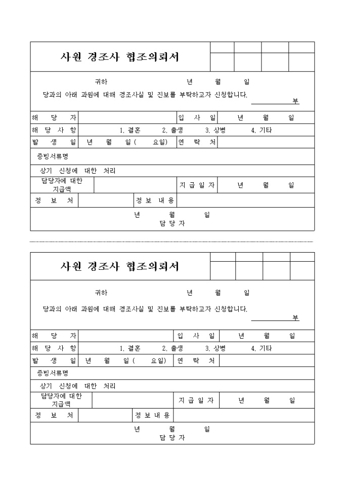 경조사실 및 진보를 부탁하고자 할 때 사용하는 의뢰서 양식입니다. 해당자와 사항, 날짜 지급액등을 표기하도록 되어 있습니다.