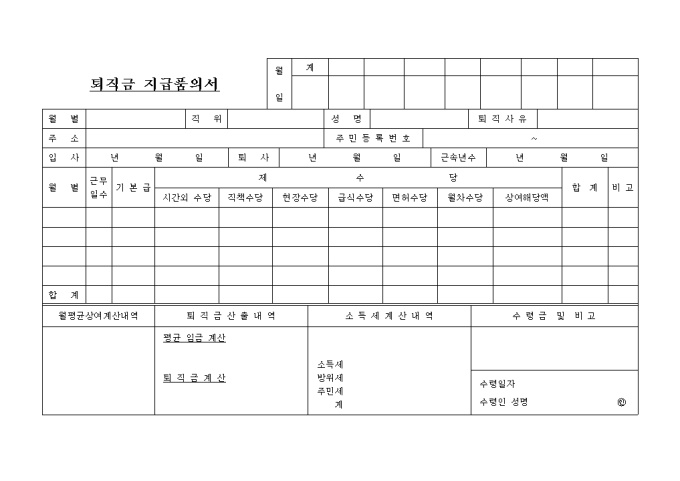 9,000원/월퇴직금에 대한 상세한 세부 사항을 일목요연하게 정리하여 기록하는 양식입니다. 기본급, 제수당, 퇴직금산출내역, 소득세계산내역등의 내용을 기입합니다.