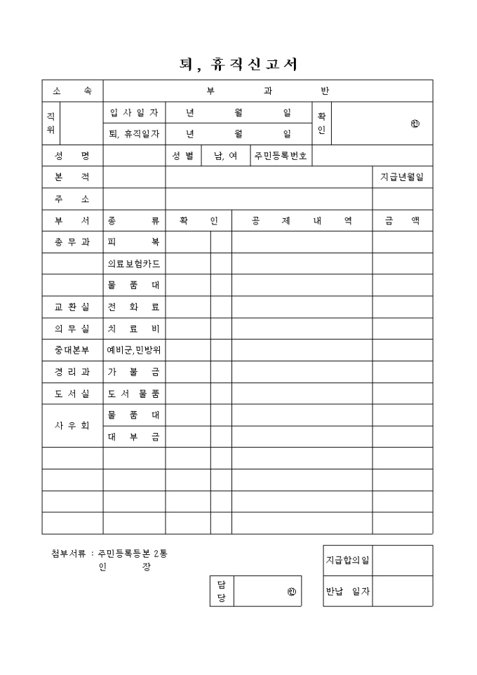 9,000원/월퇴직 및 휴직에 대한 신고서 양식입니다. 각 부서별 확인사항이나 공제내역등을 기재합니다.