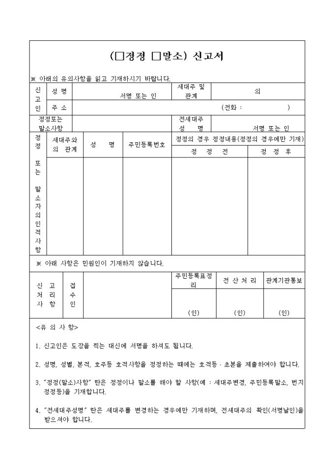 9,000원/월정정,말소를 신고할 때 사용하는 양식입니다.신고인정보와 정정 또는 말소자의 인정사항과 신고처리사항등을 기입하도록 되어 있습니다.