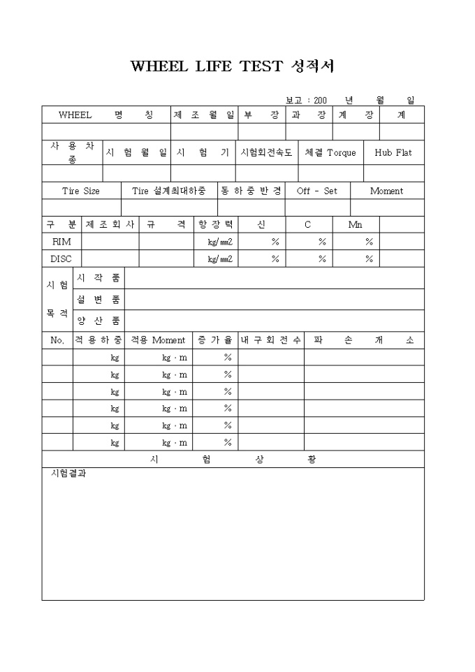 WHEEL LIFE TEST 성적서 양식입니다. 명칭, 제조월일, 사용차종, 시험월일, 시험기, 시험목적등의 내용으로 구성되어 있습니다.
