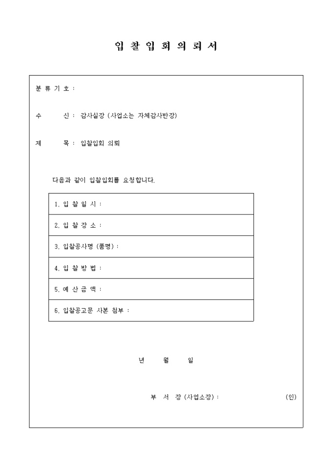 9,000원/월감사실장 (사업소는 자체감사반장)에게 입찰입회를 의뢰할 때 사용하는 양식입니다.