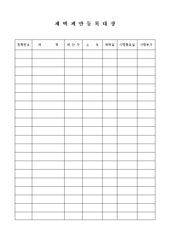 9,000원/월채택된 업무개선안의 제목과 제안자, 소속, 채택일, 시행통보일, 시행부서 등을 기록하여 관리하는 장부 양식입니다.