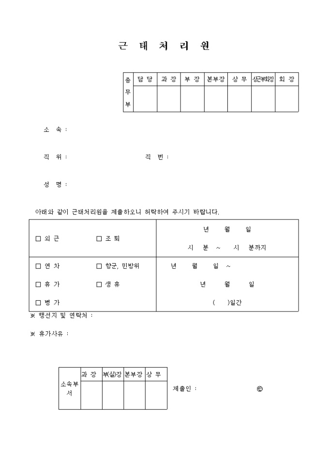 9,000원/월외근, 조퇴, 연차 향군, 민방위, 휴가등에 대한 근태처리원 양식입니다.
