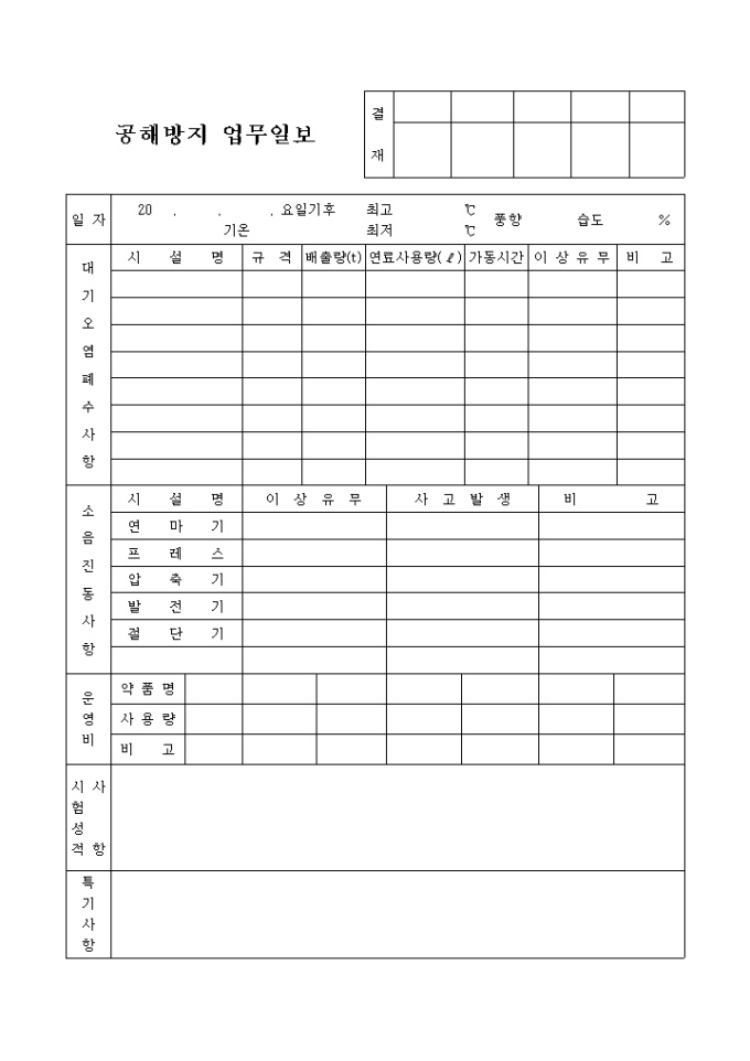 9,000원/월공해방지업무일보 양식입니다. 대기오염폐수사항, 소음진동사항, 운영비, 시험성적사항, 특기사항등의 상세항목으로 구성된 양식입니다.