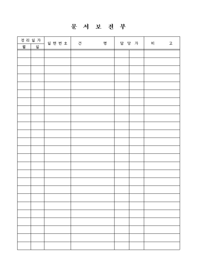 9,000원/월문서보전부 양식입니다. 정리일자, 일련번호, 건명, 담당자, 비고의 항목으로 구성된 양식입니다.