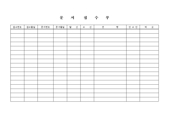 9,000원/월문서접수부 양식입니다. 접수번호, 접수월일, 문서번호, 문서월일, 발신, 수신, 건명등의 항목으로 구성된 양식입니다.