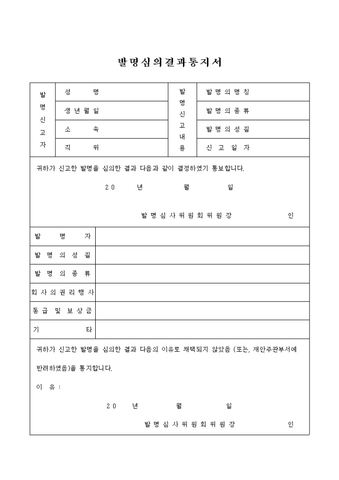 9,000원/월발명심의결과통지서 양식입니다. 귀하가 신고한 발명을 심의한 결과 다음과 같이 결정하였기 통보합니다. ...