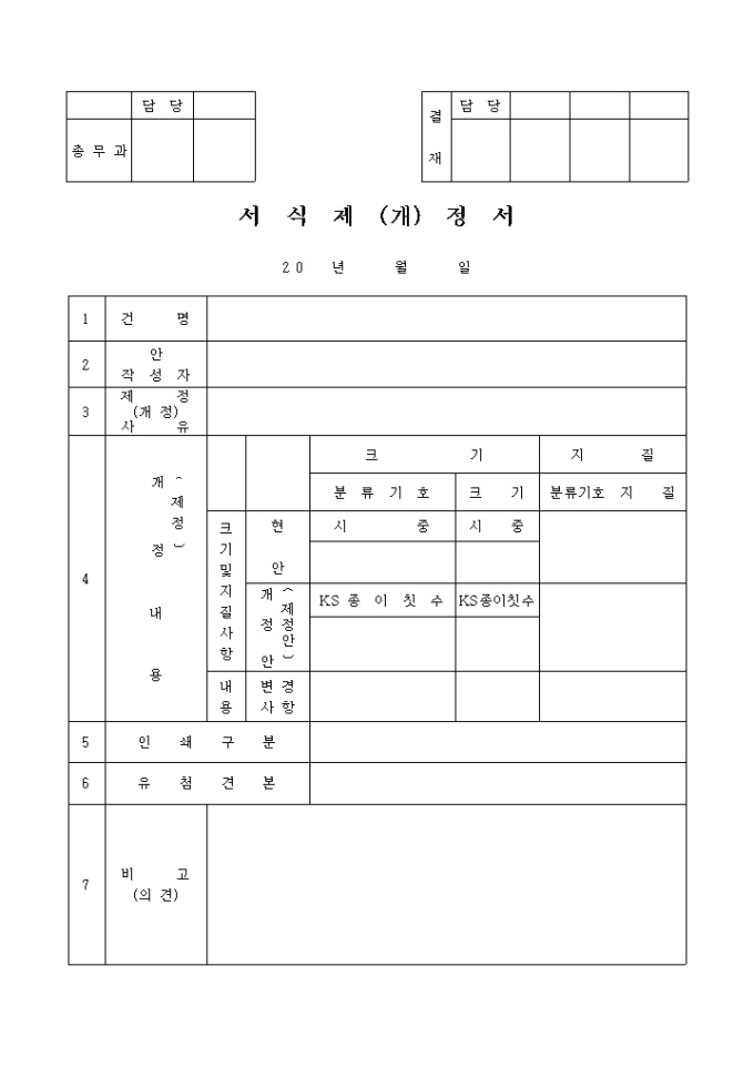 서식제(개)정서 양식입니다. 건명, 작성자, 개정사유, 개정내용, 인쇄구분, 유첨견본, 비고등의 항목으로 구성된 양식입니다.