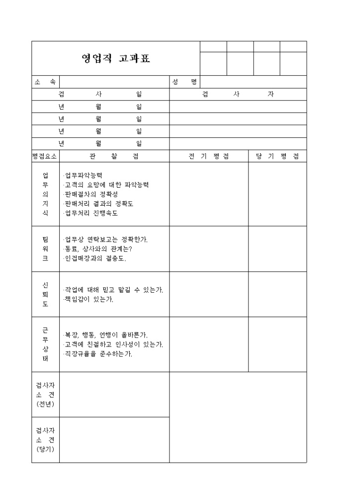 9,000원/월업무지식, 팀워크, 신뢰도, 근무상태, 검사자소견등의 평가 기준으로 영업직고과표 작성하는 양식입니다.