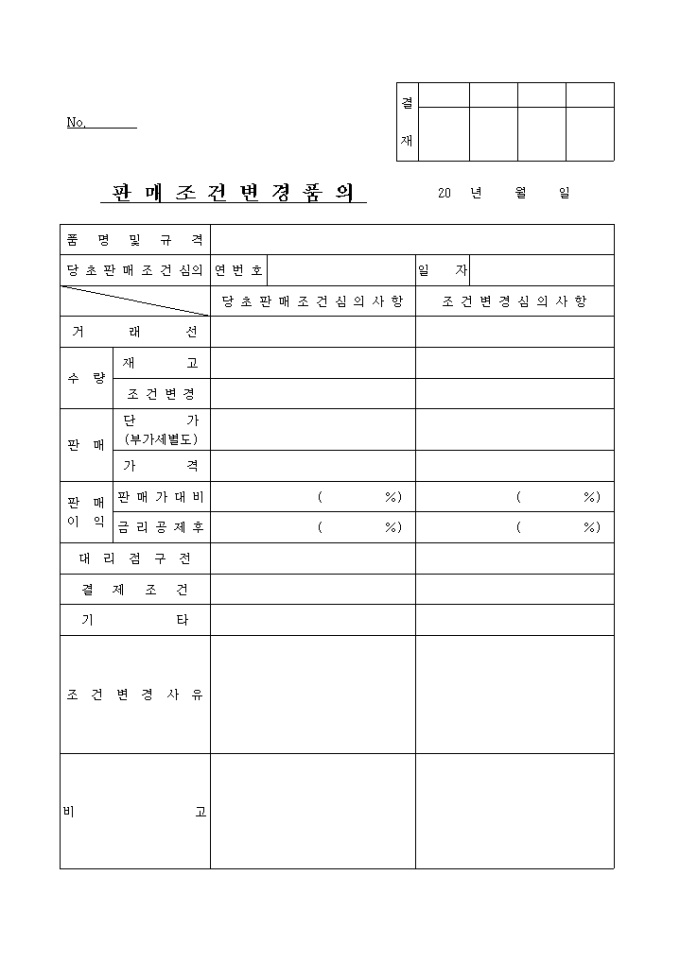 당초 판매조건 심의사항과 조건변경 심의사함으로 구분된 판매조건변경품의 양식입니다.